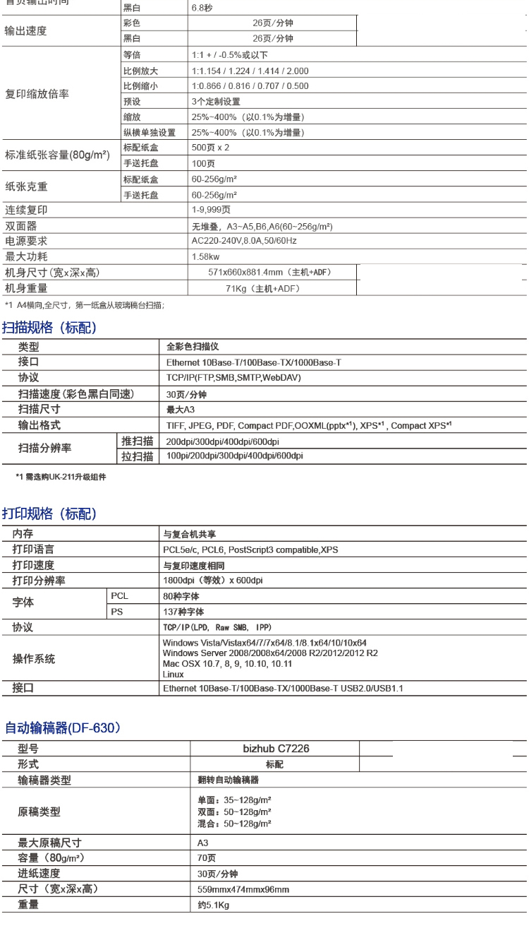 • 商品名称:柯尼卡美能达 bizhub C7226 A3彩色多功能复合机 (C7226主机+双纸盒+双面自动输稿器+双面+网络+原装工作底柜(落地))(单位:台)