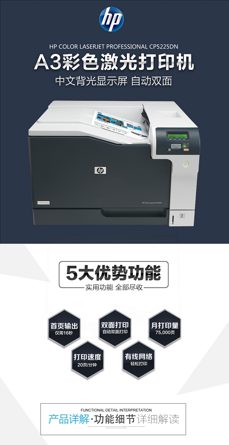 商品名称: 惠普 HP COLORLASERJET CP5225DN 有线网络打印/自动双面打印/彩色激光 激光打印机