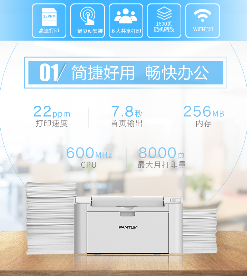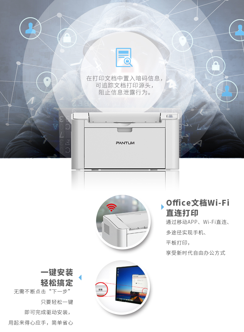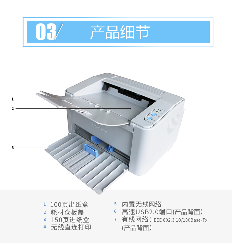 • 商品名称:奔图 PANTUM P2535NW(无线/有线网络打印/手动双面打印/黑白)激光打印机