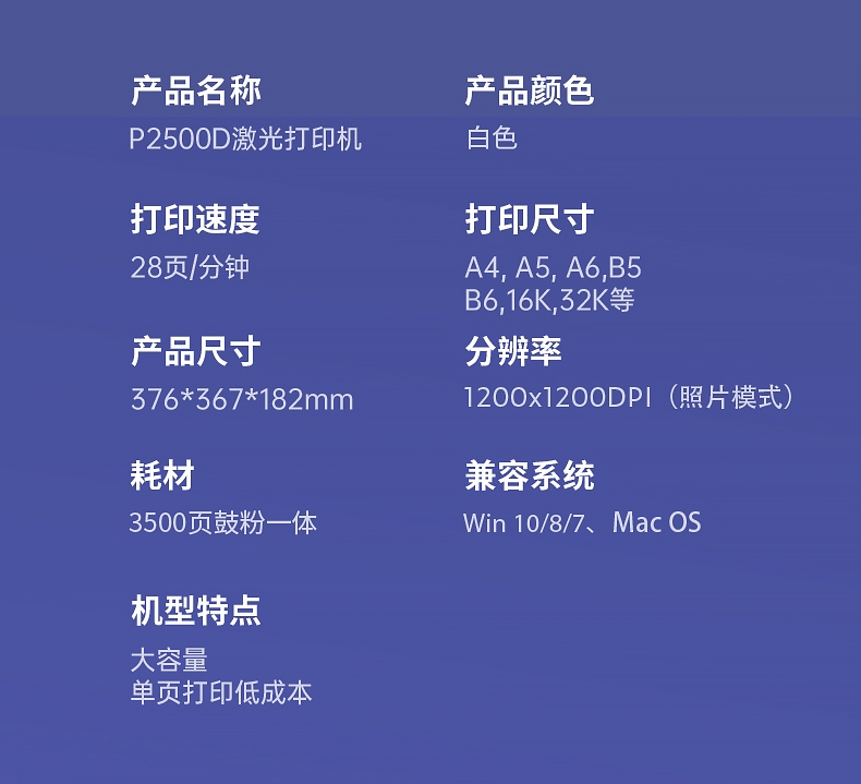 商品名称: 得力 DELI P2500D(有线/无线网络打印/自动/黑白/1年)激光打印机