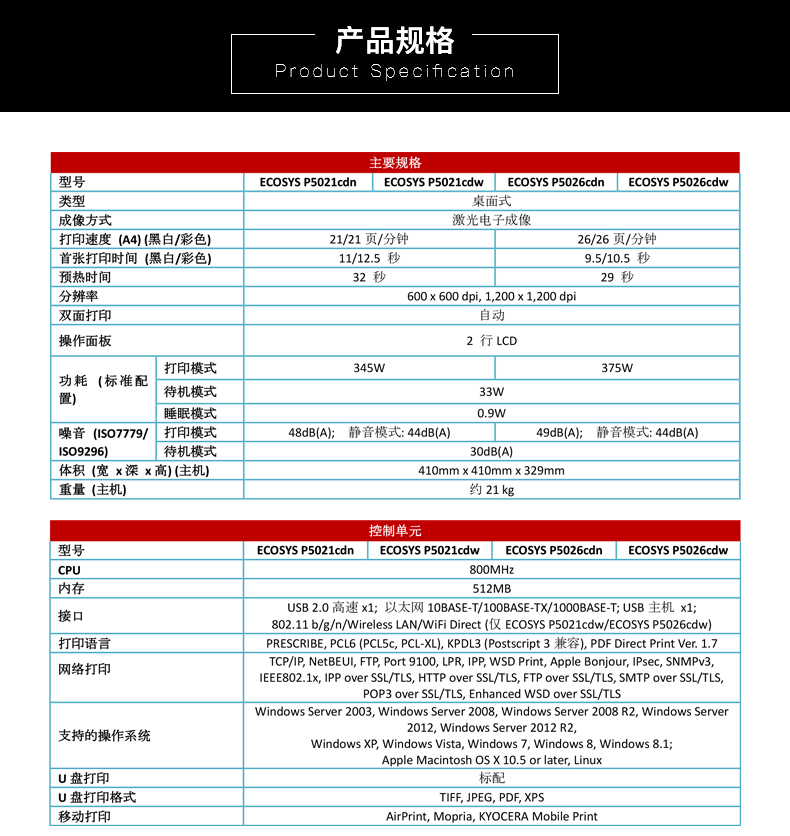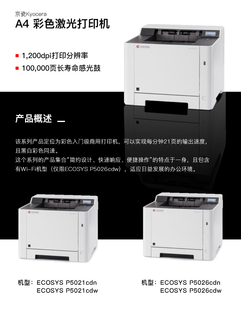 商品名称: 京瓷 KYOCERA ECOSYS P5021CDN(有线网络打印/自动双面打印/彩色)激光打印机
