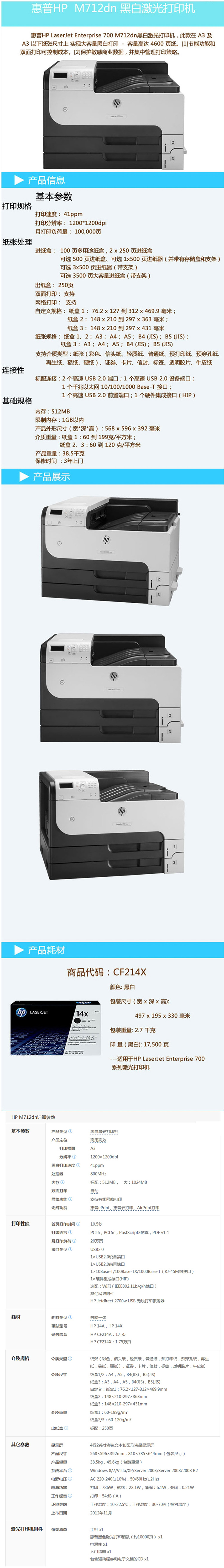 • 商品名称:惠普 HP LASERJET M712DN(有线网络打印/自动双面打印/黑白激光)激光打印机