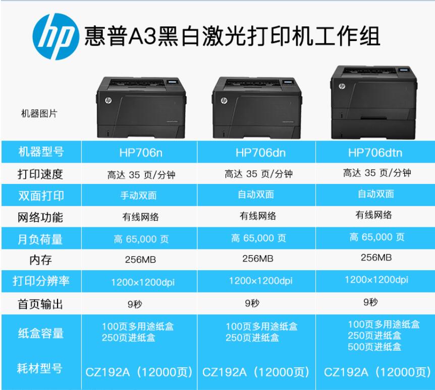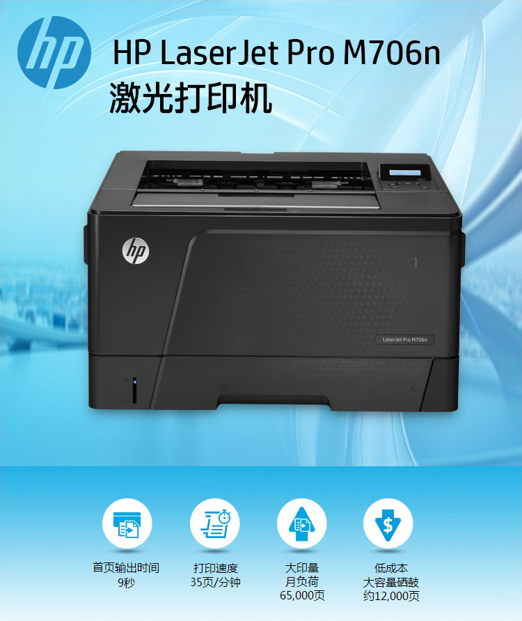 商品名称: 惠普 HP LASERJET PRO M706DN(有线网络打印/自动双面打印/黑白)激光打印机