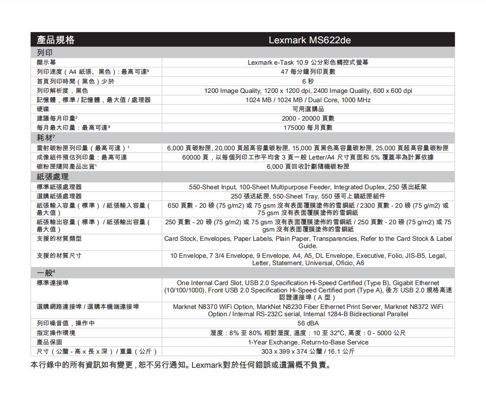 办公设备  > 打印/复印设备  > 激光打印机  >  利盟/LEXMARK  >  利盟 LEXMARK MS622DE(有线网络打印/自动双面打印/黑白)激光打印机