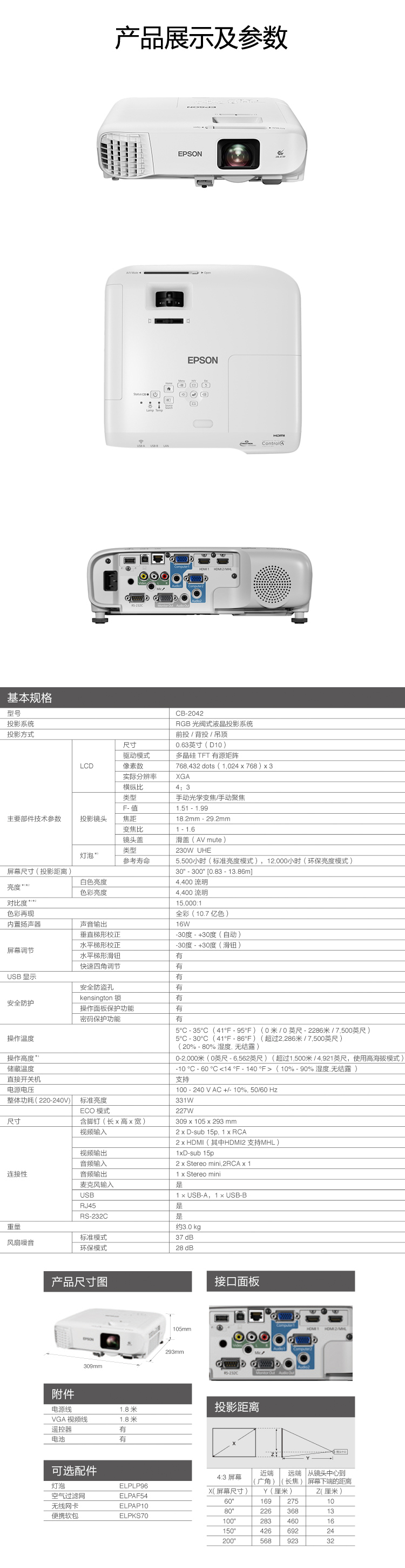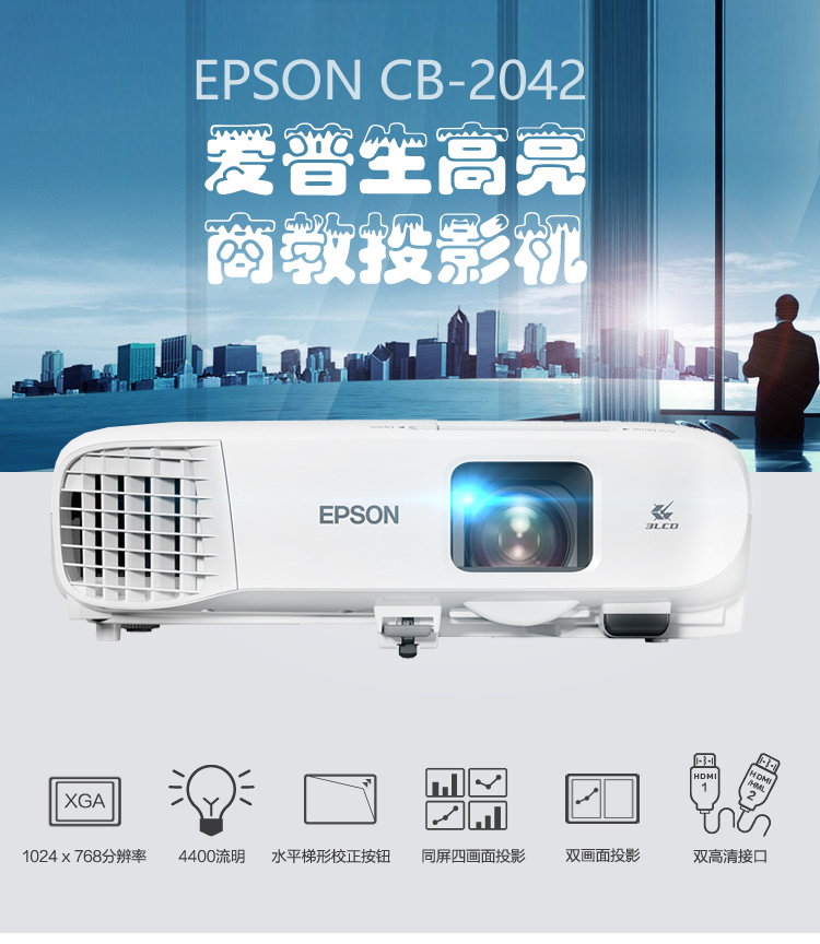 • 商品名称:爱普生 EPSON CB-2042(3LCD/4400流明/1024×768DPI)投影机