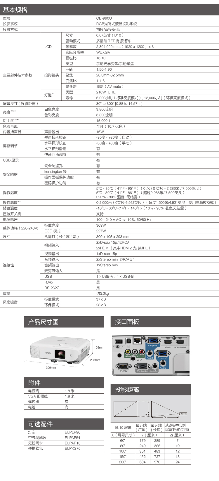 • 商品名称:爱普生 EPSON CB-990U(3LCD/3800流明/1920×1200DPI)投影机
