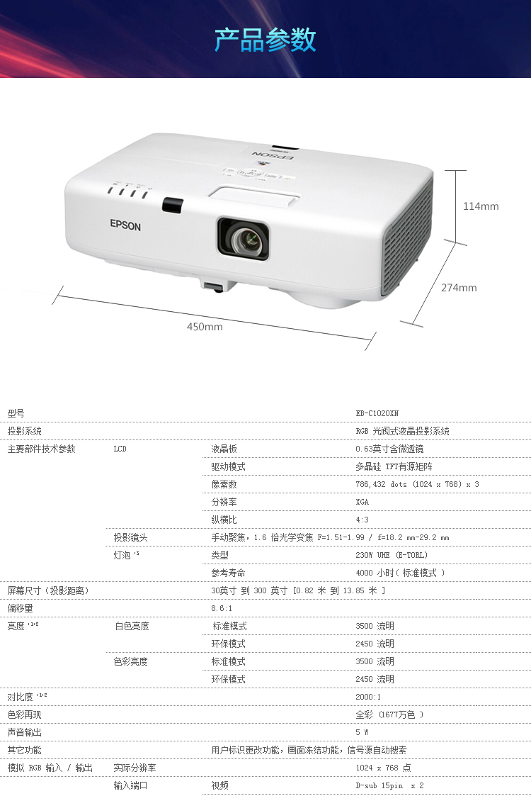• 商品名称:爱普生 EPSON EB-C1020XN(3LCD/3500流明/1024×768DPI)投影机