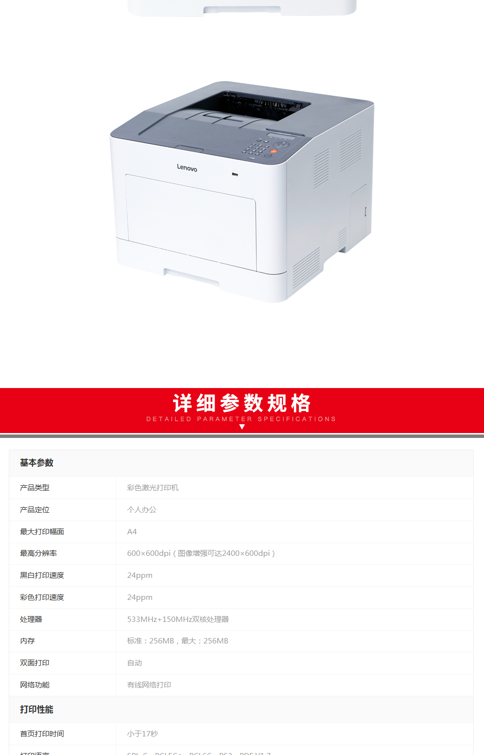 商品名称: 联想 LENOVO CS2410DN (有线网络打印/自动双面打印/彩色激光) 打印机