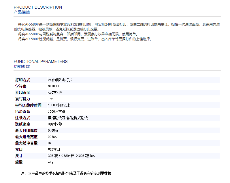 办公设备  > 打印/复印设备  > 针式打印机  >  得实/Dascom  >  得实 AR-580P A4 平推 针式打印机