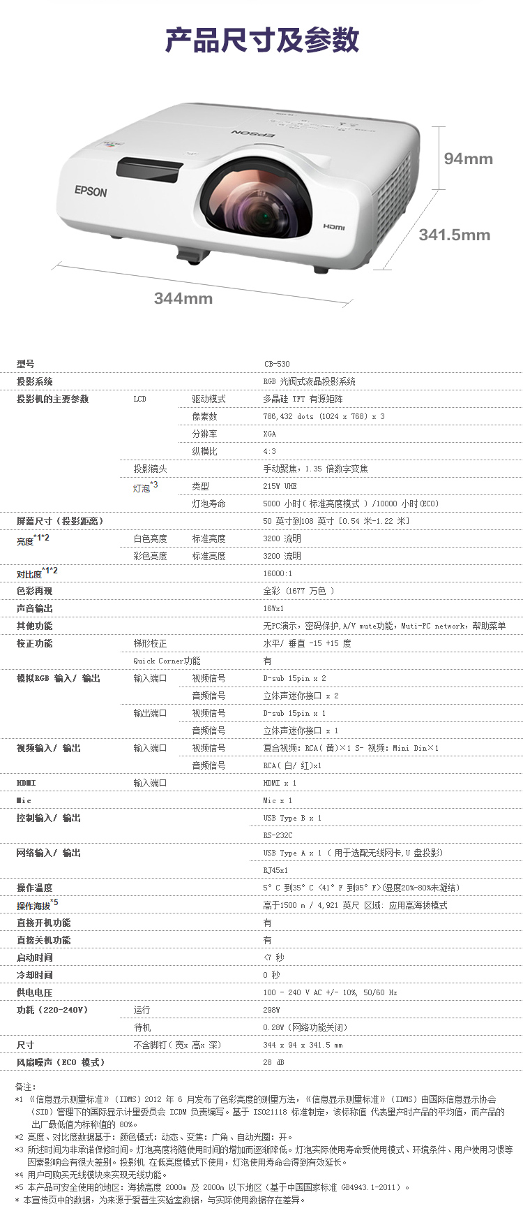 • 商品名称:爱普生 EPSON CB-530(LCD/3200流明/1024×768DPI)投影机