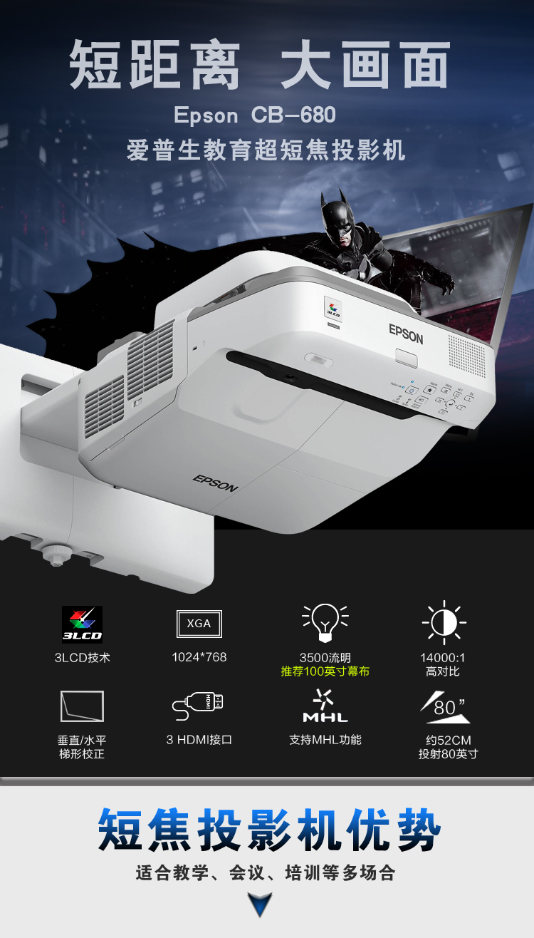商品名称: 爱普生 EPSON CB-680(3LCD/3500流明/1024×768DPI)投影机