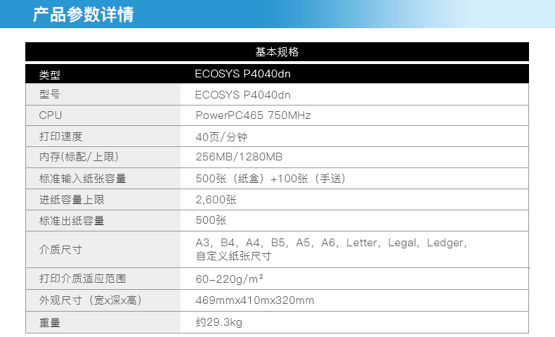 商品名称: 京瓷 KYOCERA ECOSYS P4040DN(有线网络打印/自动双面打印/黑白)激光打印机