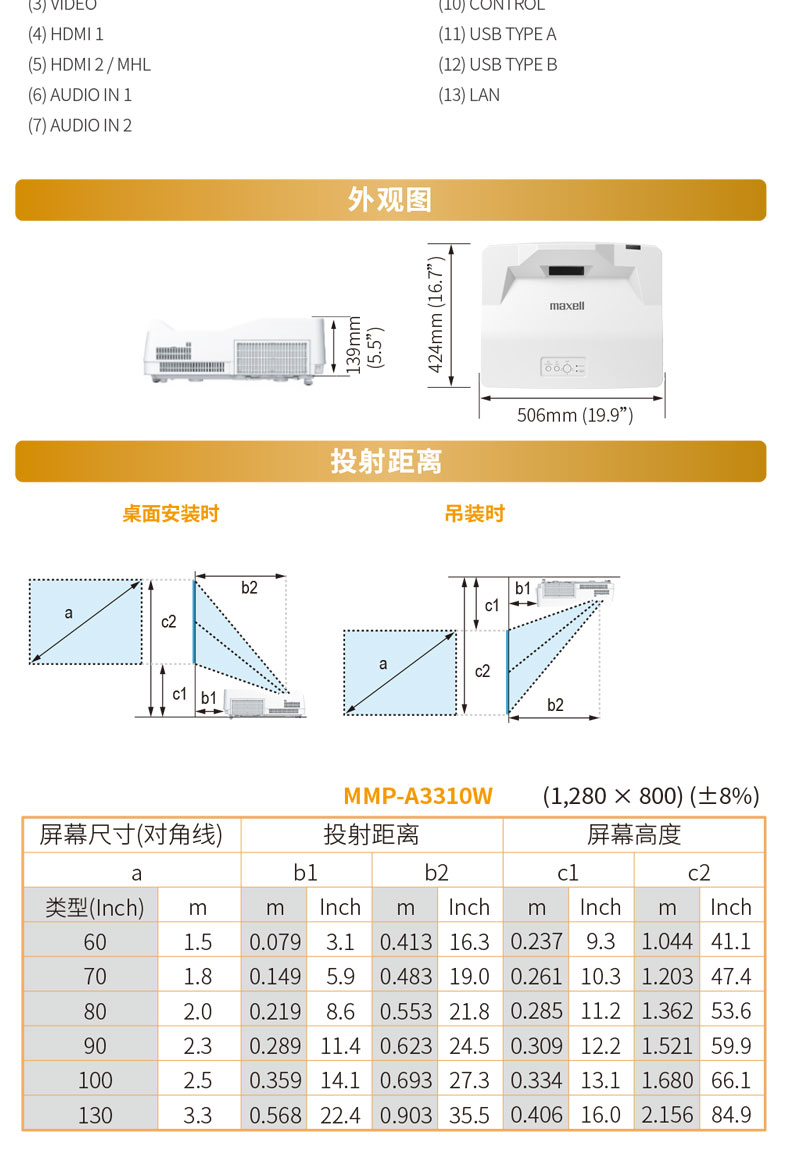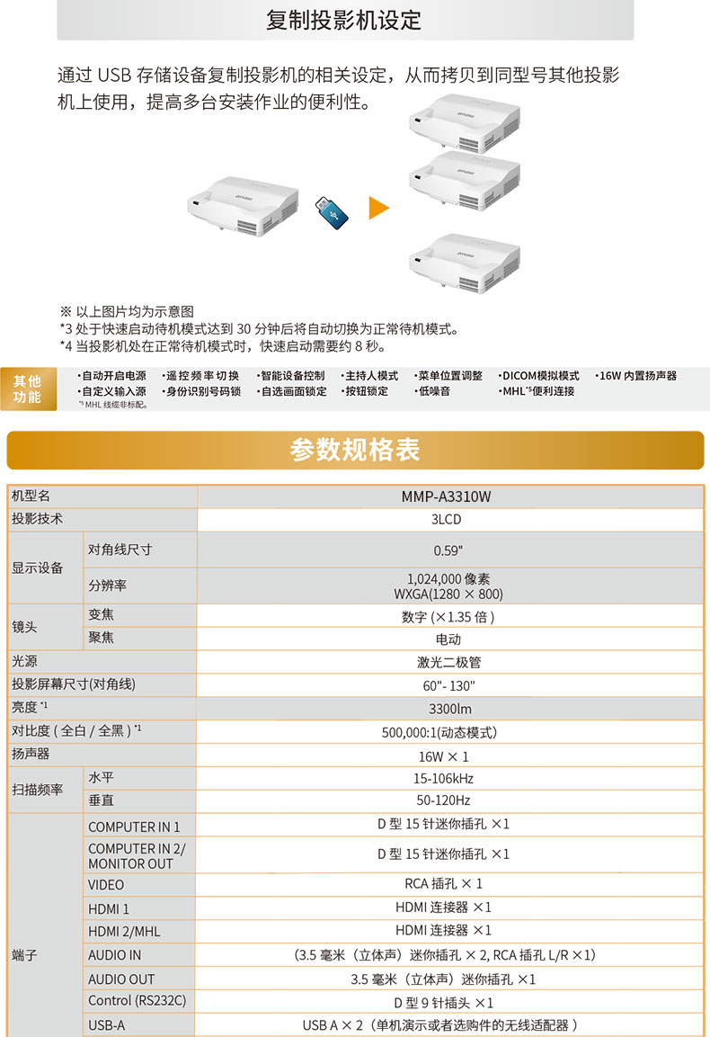 • 商品名称:麦克赛尔 MAXELL MMP-A3310W (LCD/3300流明/1280×800DPI) 投影机