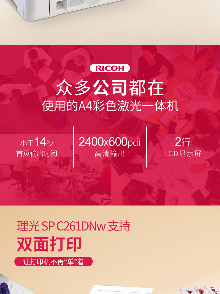 理光 RICOH SP C261DNW(无线/有线网络打印/自动双面打印/彩色)激光打印机