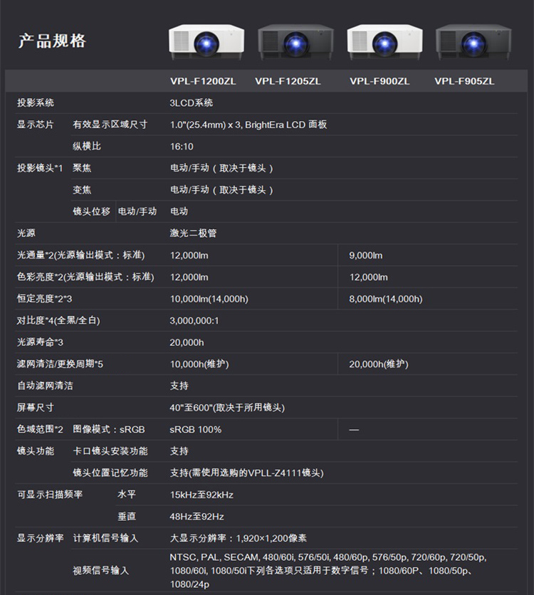 • 商品名称:索尼 SONY VPL-F905ZL(LCD/9000流明/1920×1200DPI)投影机