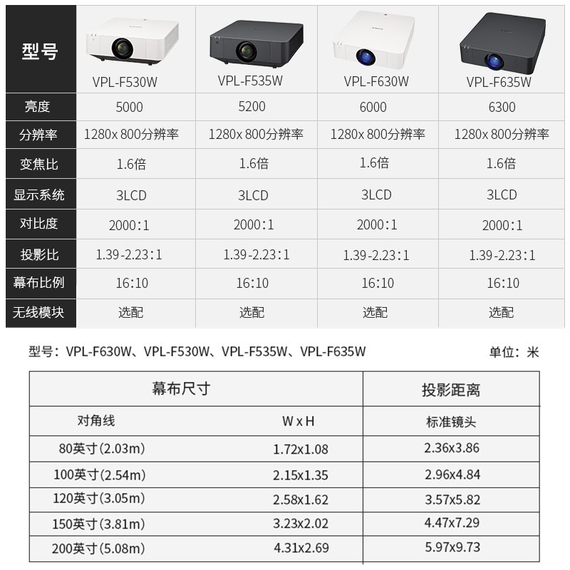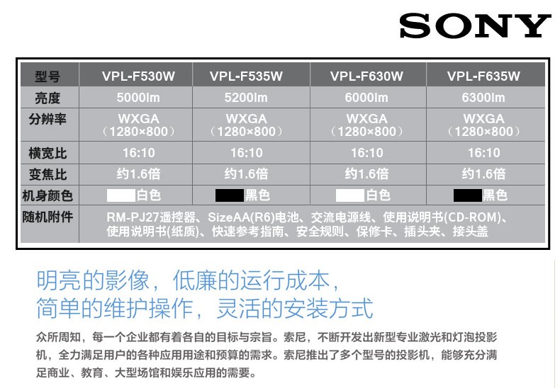 • 商品名称:索尼 SONY VPL-F530W(3LCD/5000流明/1280×800DPI)投影机