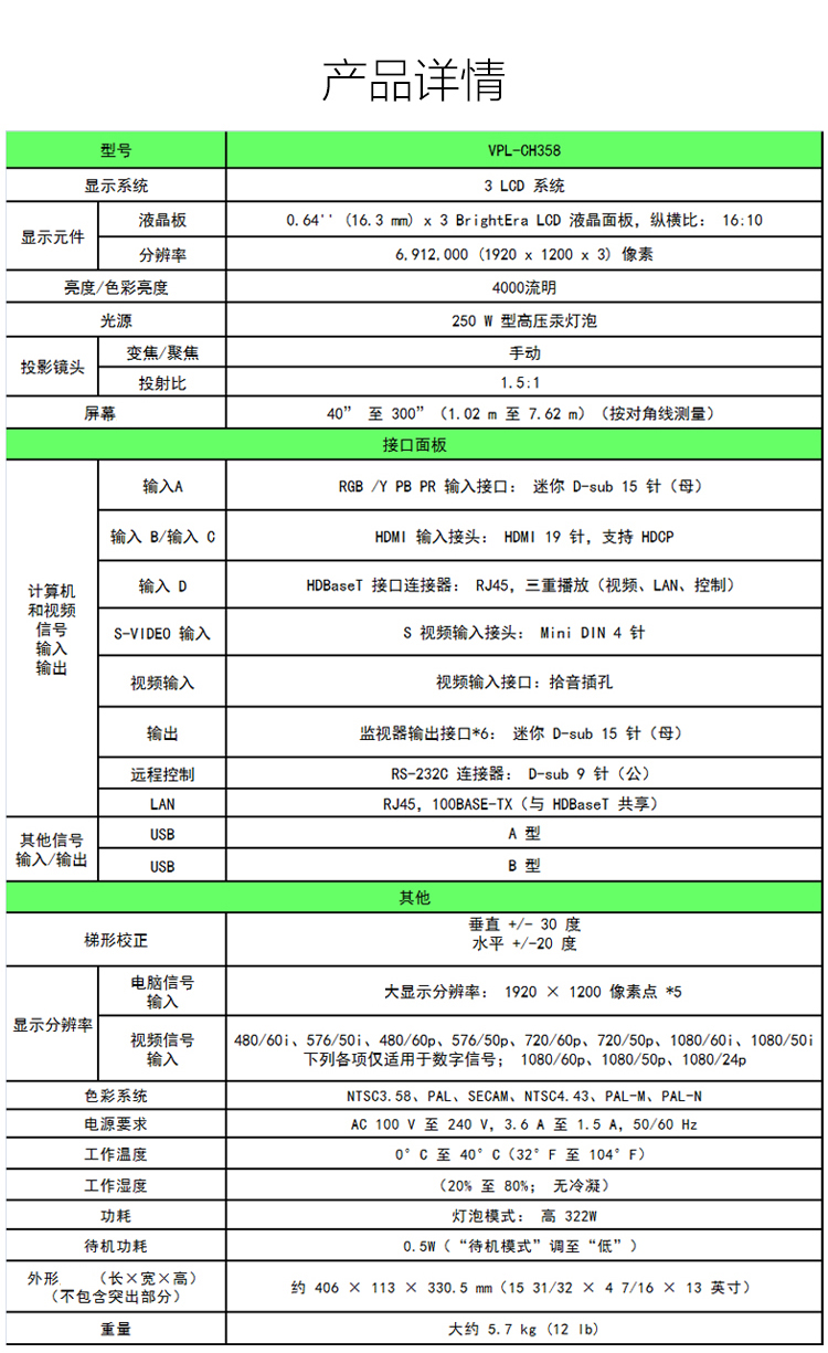 • 商品名称:索尼 SONY VPL-CH358(LCD/4000流明/1920×1200DPI)投影机