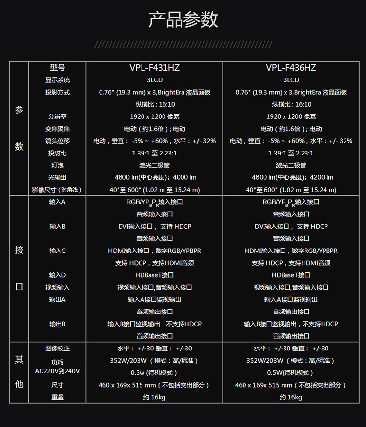 • 商品名称:索尼 SONY VPL-F436HZ(LCD/4200流明/1920×1200DPI)投影机