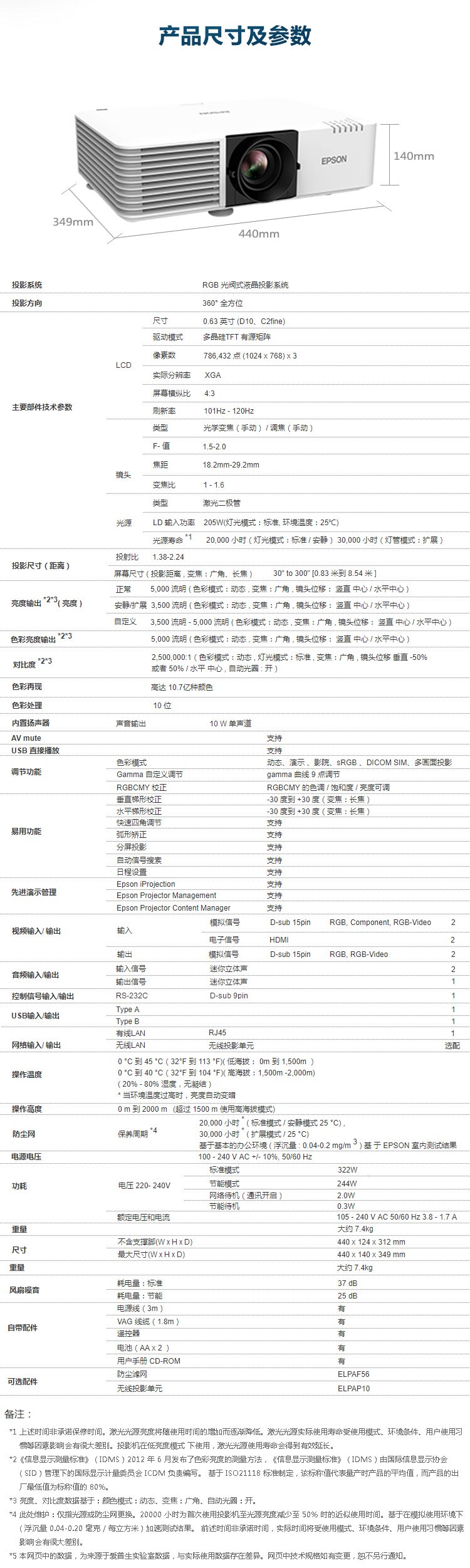 • 商品名称:爱普生 EPSON CB-L500(LCD/5000流明/1024×768DPI)投影机