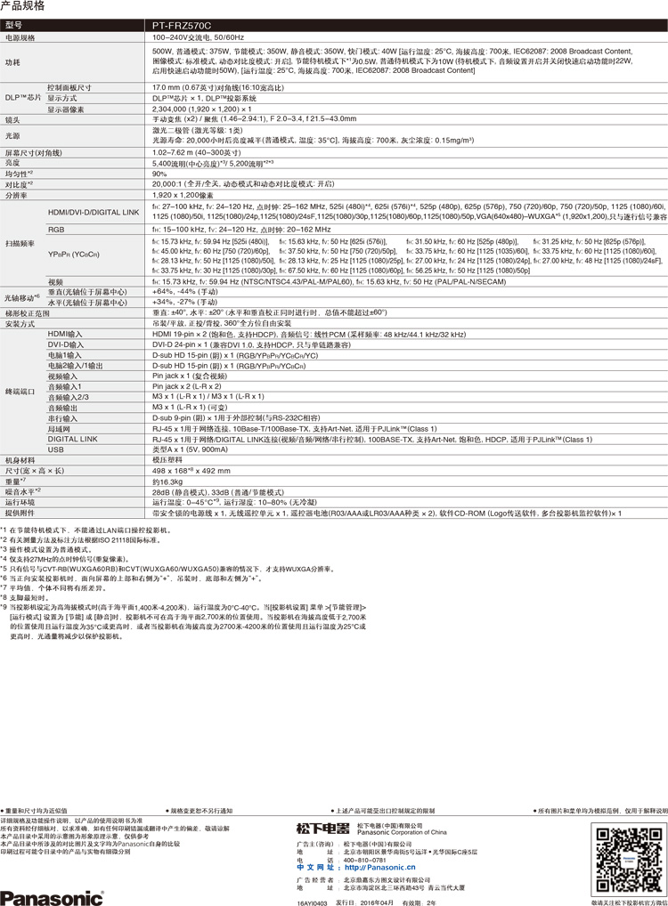 • 商品名称:松下 PANASONIC PT-FRZ570C(DLP/5400流明/1920×1200DPI)投影机