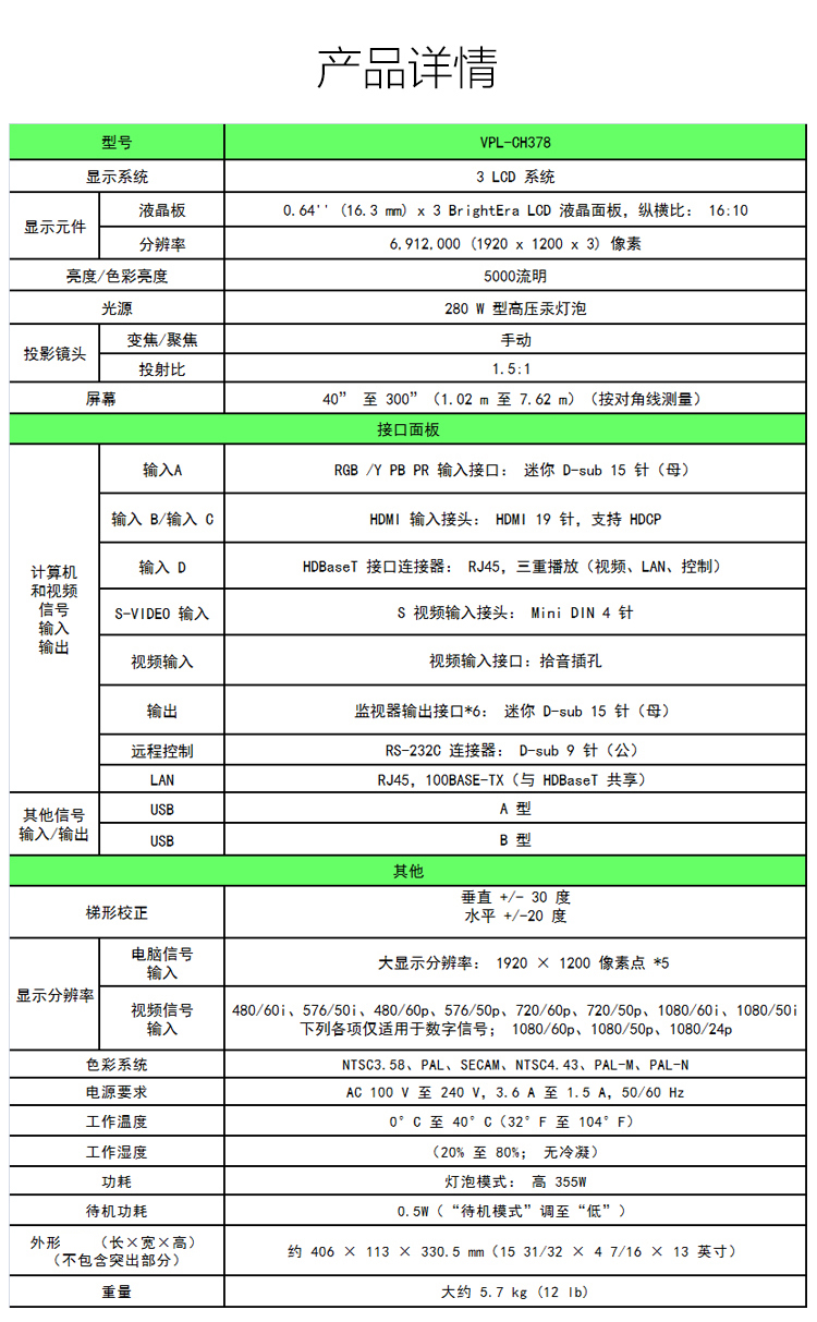 • 商品名称:索尼 SONY VPL-CH378(3LCD/5000流明/1920×1200DPI)投影机