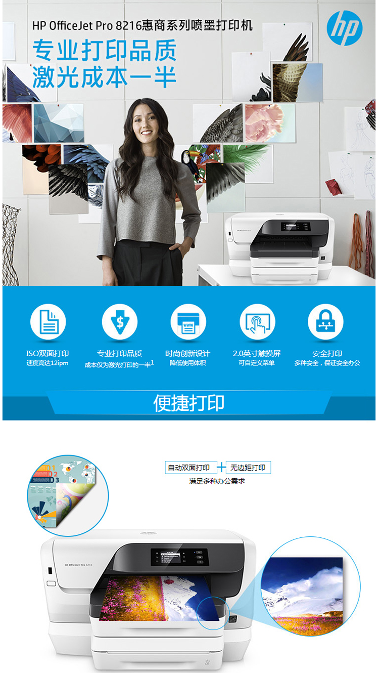 办公设备  > 打印/复印设备  > 喷墨打印机  >  适盒/A4BOX  >  惠普 HP OfficeJet Pro 8216 Printer 彩色打印机喷墨打印机 (含免费上门安装+一年上门服务) 白色(单位:台)