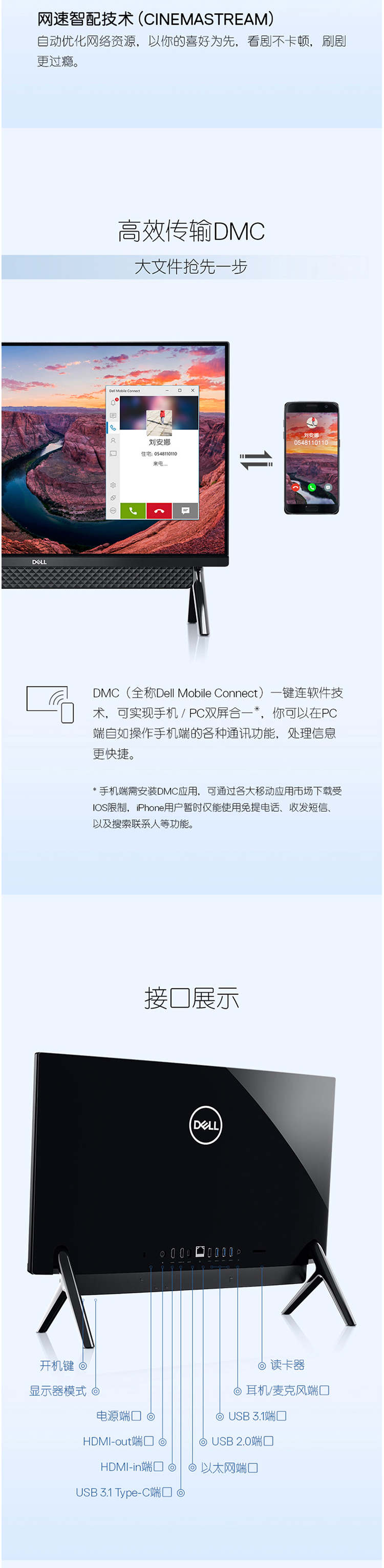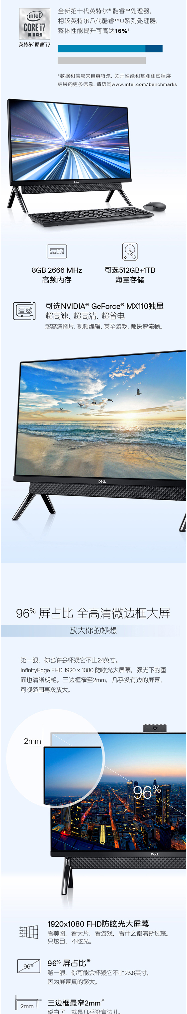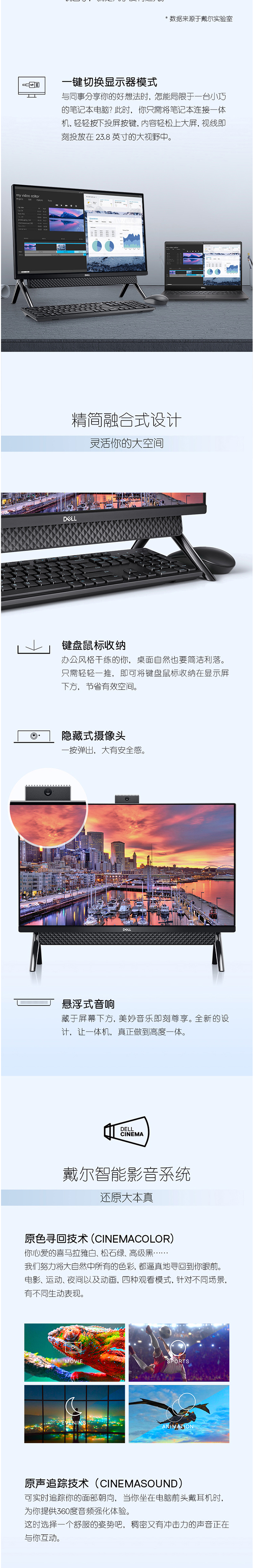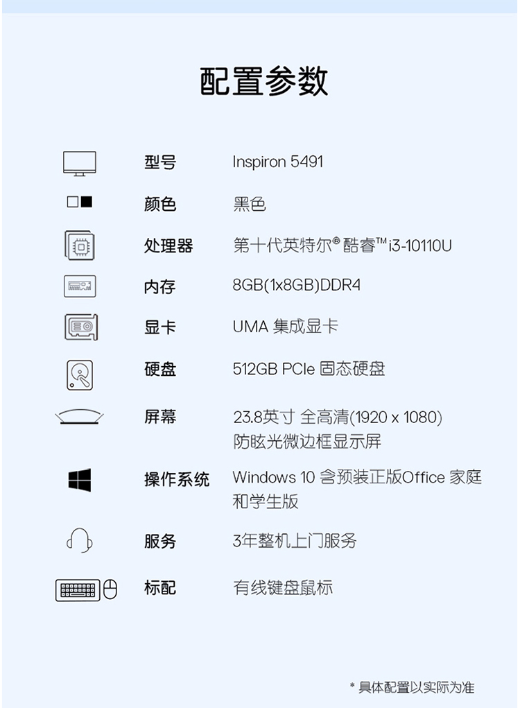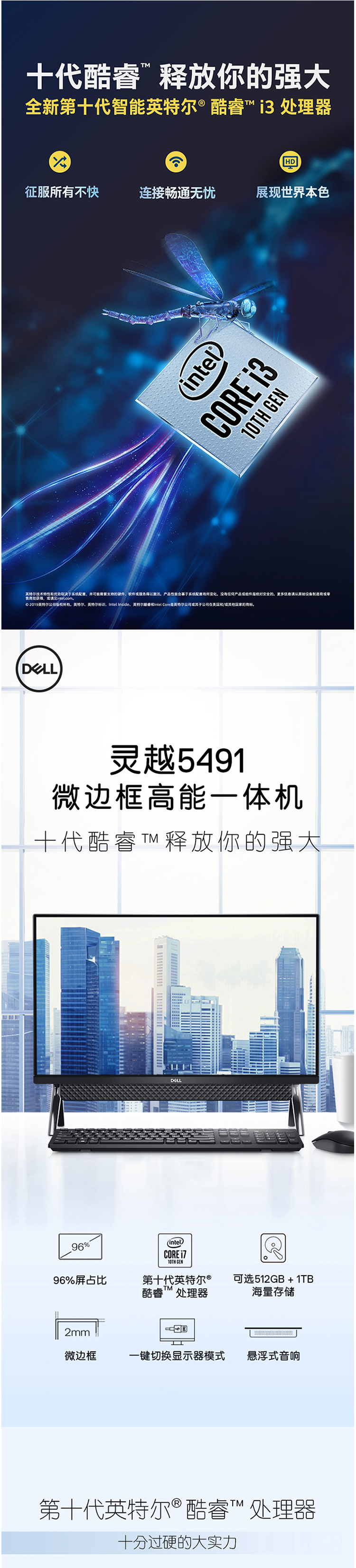 • 商品名称:戴尔(DELL)灵越AIO 5491 23.8英寸 微边框 高色域 一体机台式电脑 (十代i3-10110U 8G 512GSSD 集显)黑 (单位:台)
